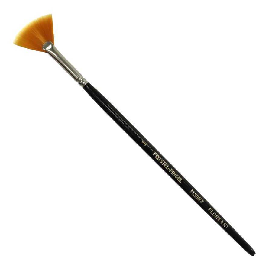 Pincel Leque de cerdas sinteticas e extra finas, com virola de metal e cabo de madeira preto.