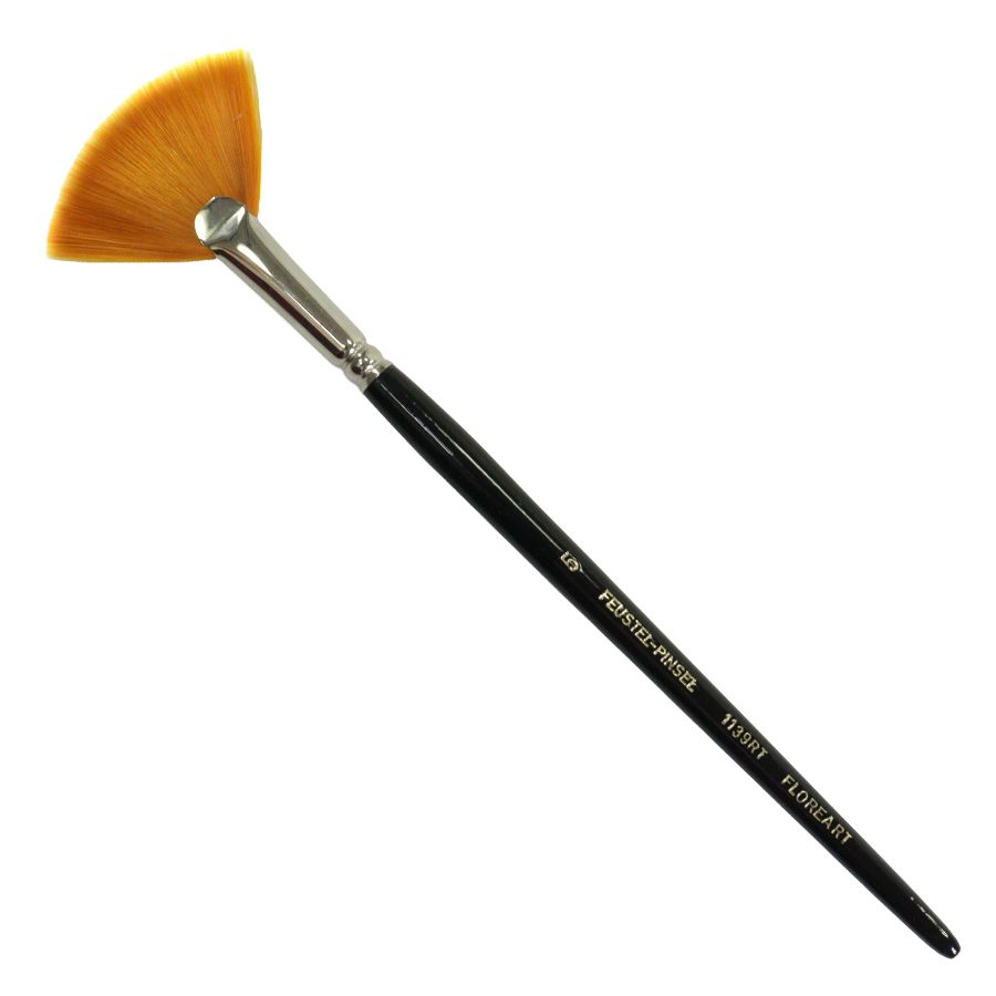 Pincel Leque de cerdas sinteticas e extra finas, com virola de metal e cabo de madeira preto.
