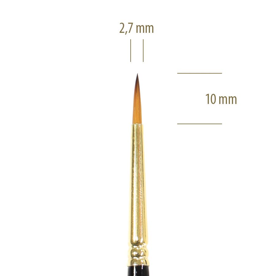 Pincel Feustel pontiagudo, feito de cerdas sintéticas extra fina, com virola de metal e cabo cilíndrico em madeira.